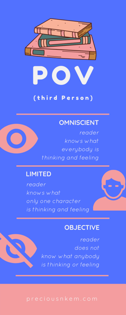 Choosing what POV suits the story you wish to tell is very important. I particularly love stories written in third person (limited) so most of the stories I write are in that POV. Check the novels you love reading. What POV was it written in? Now see if it matches your POV writing preference. Just like I explained in the last class about alternating two characters chapter by chapter when writing in first POV, you can apply the same trick in third person (limited) for a selected number of characters (not all please). The characters you choose have to be relevant to the plot of your story before you consider writing a section or chapter in their POV. Remember, always use a page separator if you want to switch to another character’s POV in the same chapter. Readers need to know from whose view a story is being narrated throughout their reading experience, try your best to make it as clear and easy to understand as possible.